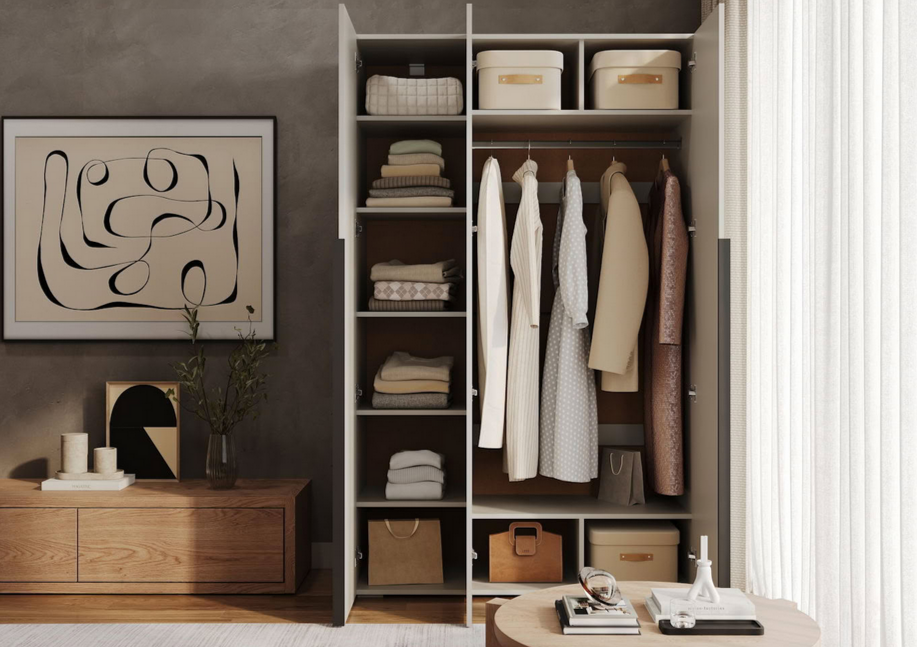 Двухстворчатая секция: Оснащена верхней полкой (антресольной) и продольной штангой для хранения одежды на вешалках.