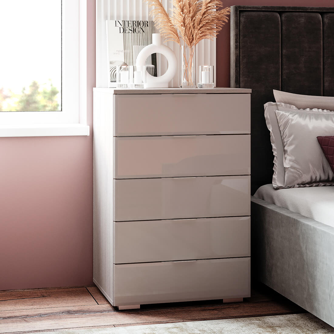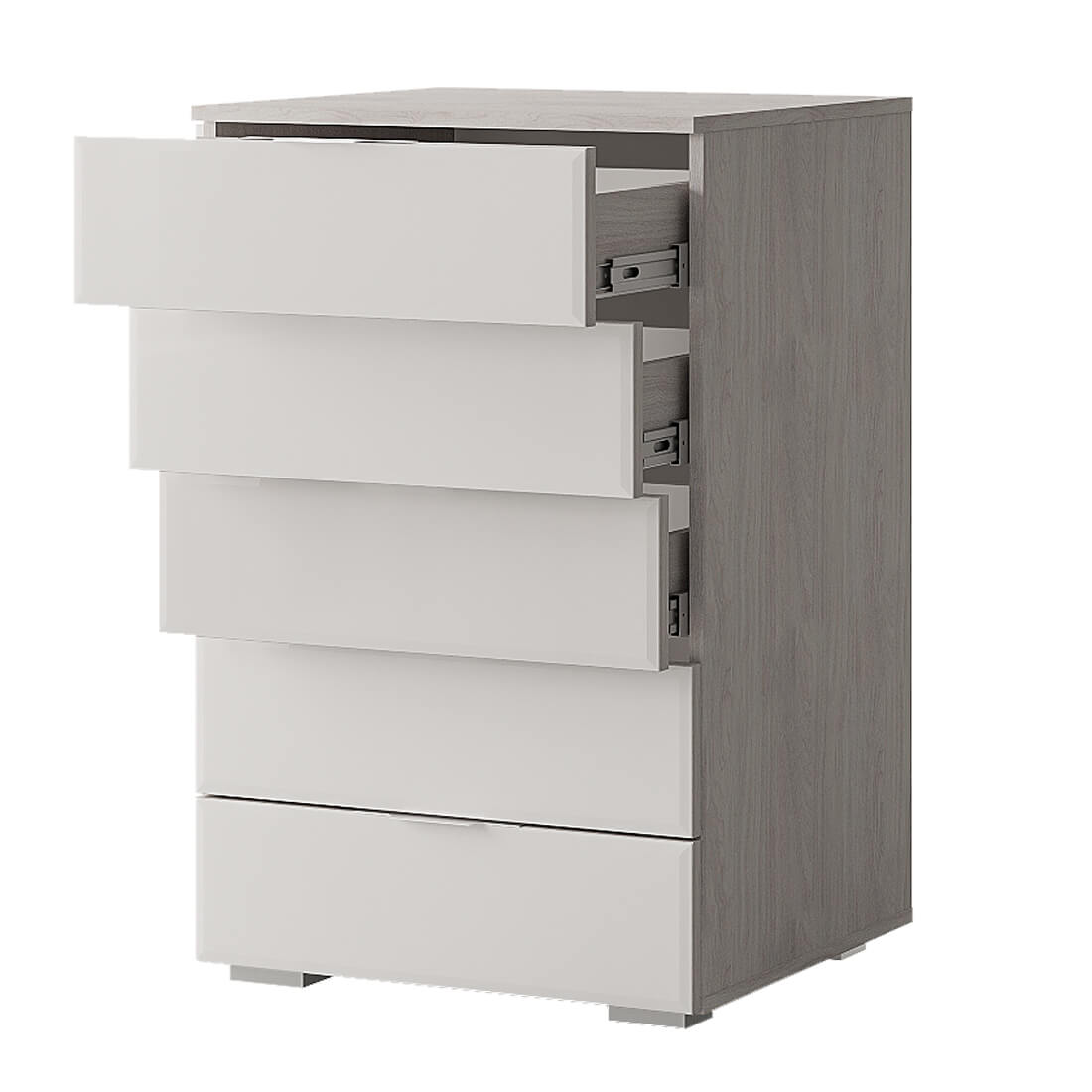 Комод «Алекса» — удобная система хранения для одежды, постельных принадлежностей или других хозяйственных аксессуаров, которая состоит из пяти вместительных выдвижных ящиков на шариковых направляющих, обеспечивающих лёгкую и бесшумную эксплуатацию модели.