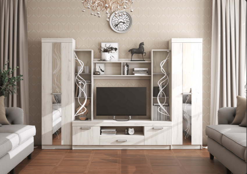 Выполненная в строгом классическом стиле стенка «Атлантида-2Б» — пример удачного совмещения элегантного дизайна и функциональности. «Атлантида» станет отличным дополнением для просторной светлой гостиной.