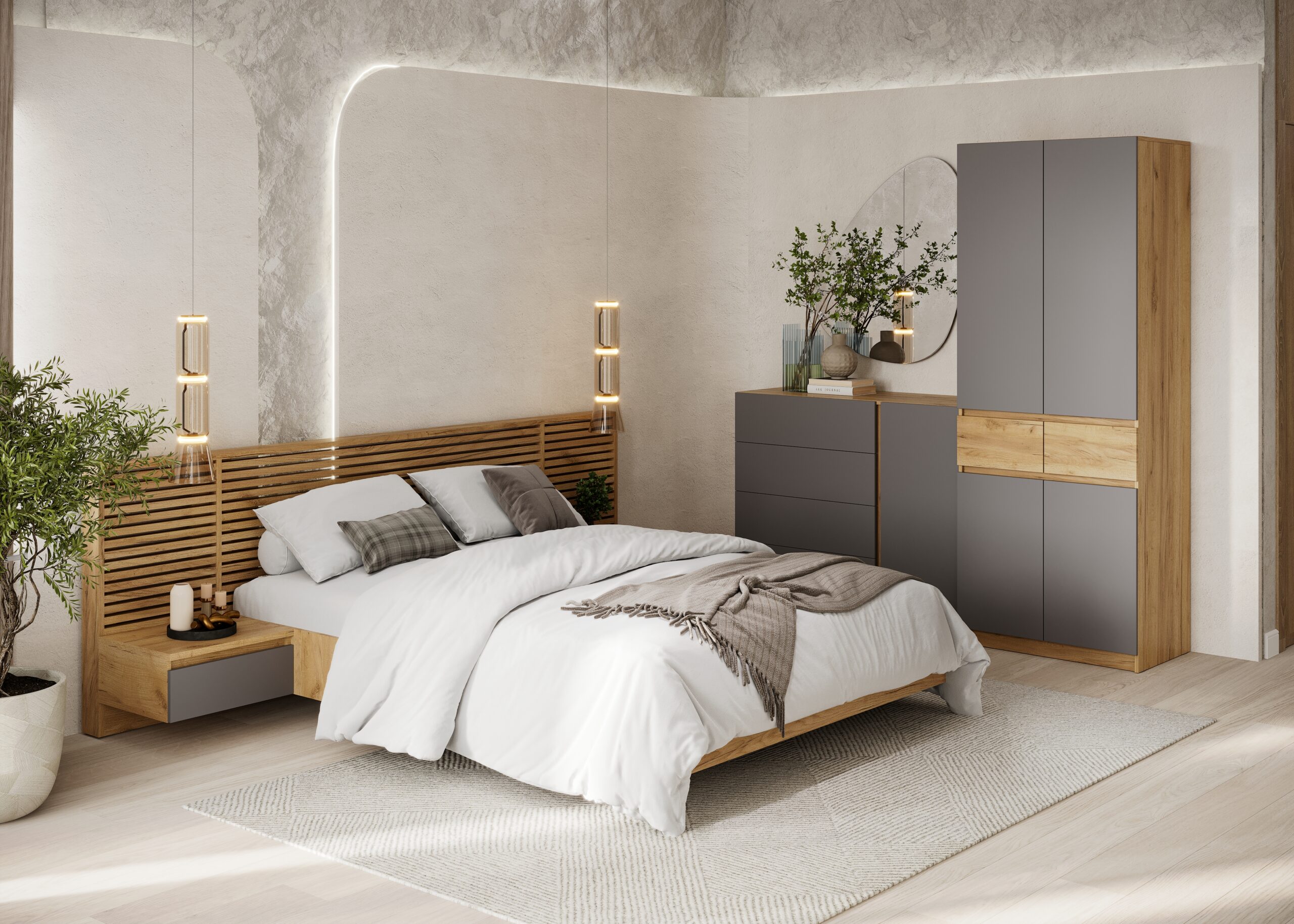 • Фасады без ручек — открываются за фасад (зазоры 30 мм скрыты декоративными планками).