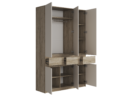 • Шкаф предусматривает наличие трех выдвижных ящиков, двух вместительных отсеков для одежды, а также множества полок