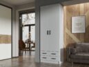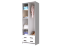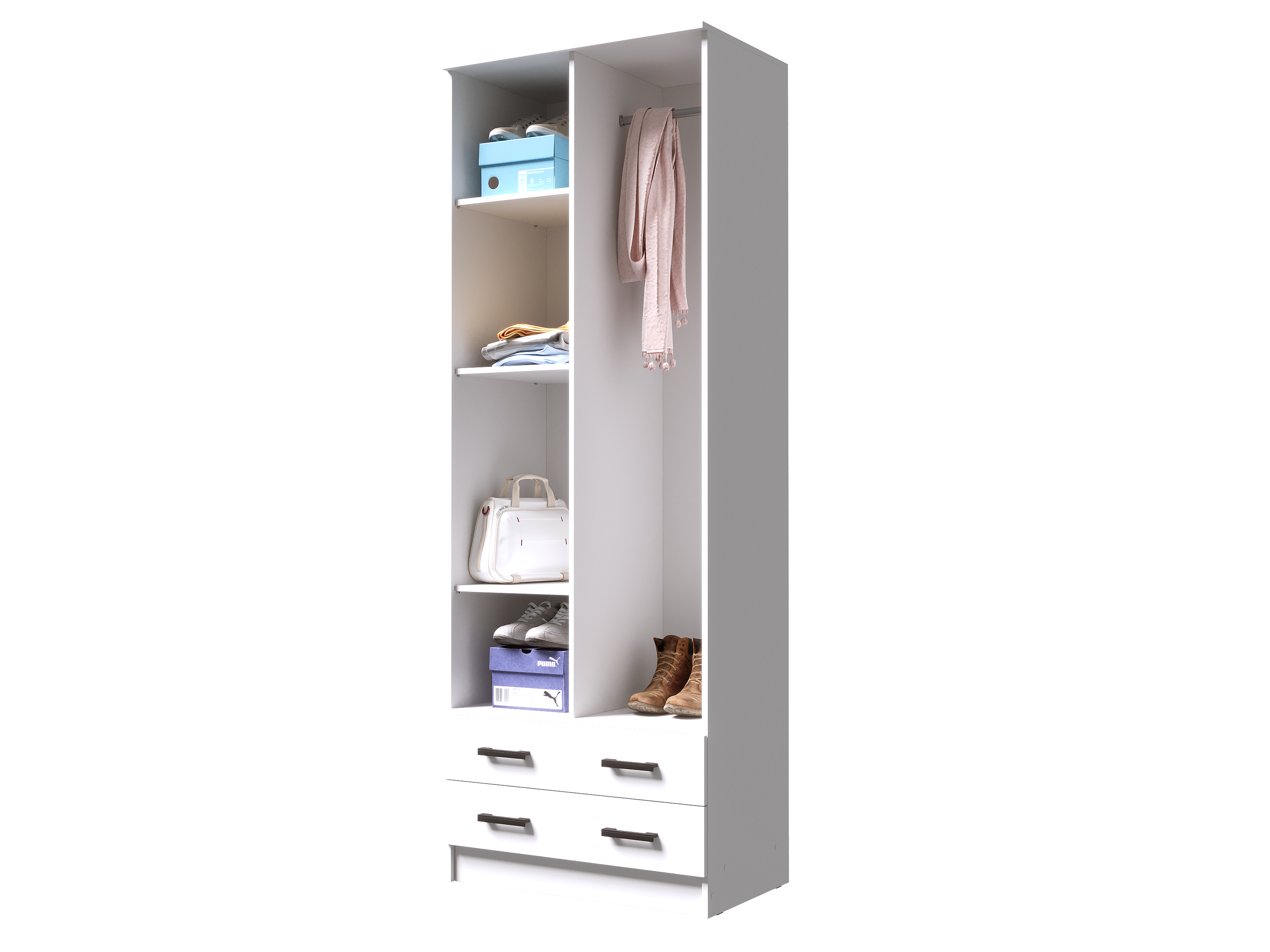 Наполнение: Шкаф разделен на зоны — за двумя распашными дверцами расположены отделение с металлической штангой для вешалок и полки для вещей. В нижней части находятся два выдвижных ящика на роликовых направляющих.