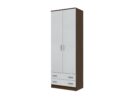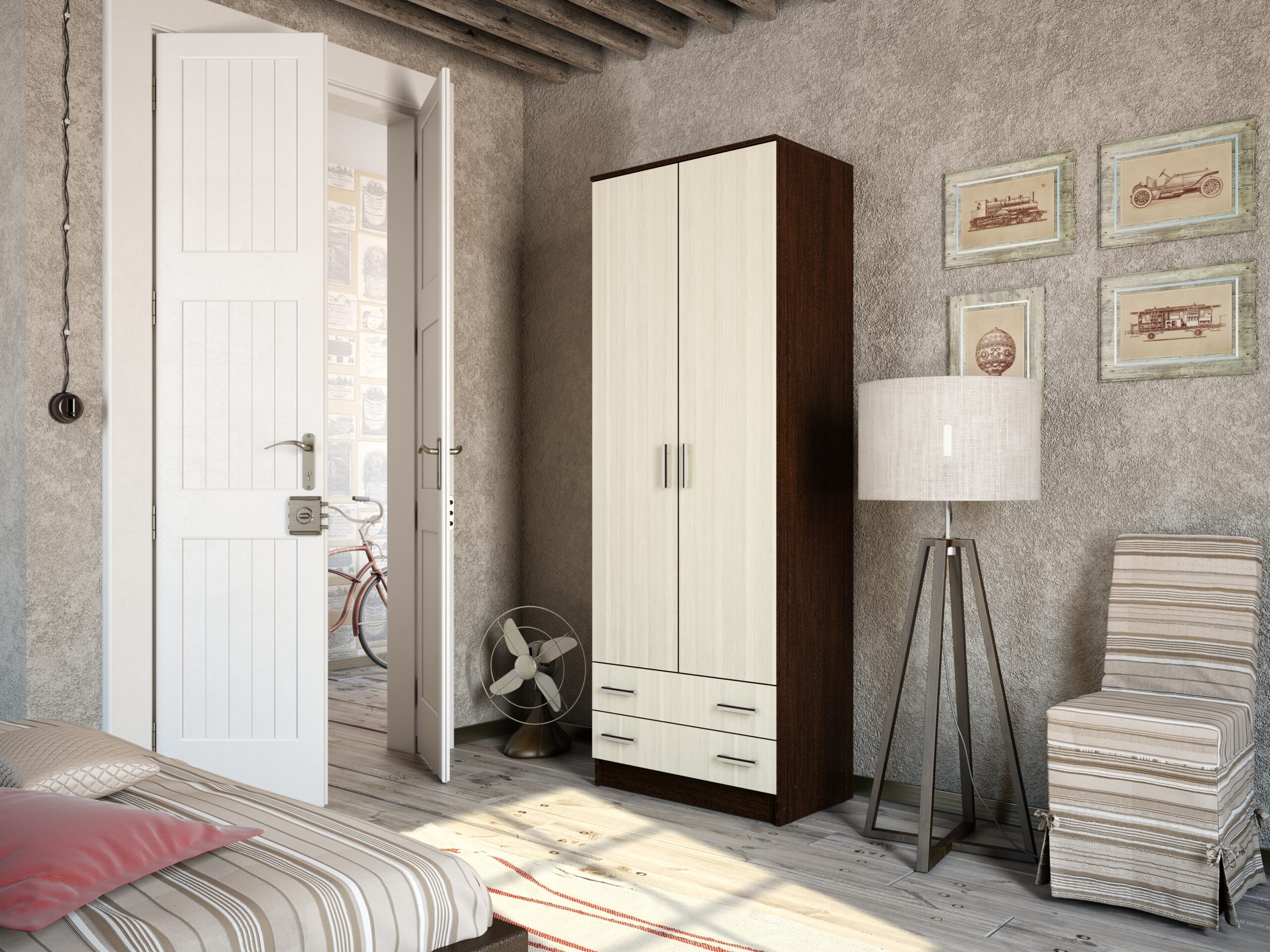 Наполнение: Шкаф разделен на зоны — за двумя распашными дверцами расположены отделение с металлической штангой для вешалок и полки для вещей. В нижней части находятся два выдвижных ящика на роликовых направляющих.