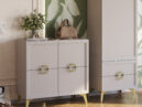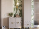 Фасады выполнены из ЛДСП в цвете «кашемир» толщиной 16 мм, а по краям фасады облицованы рамочным профилем из МДФ с рельефной фрезеровкой толщиной 26 мм.