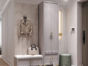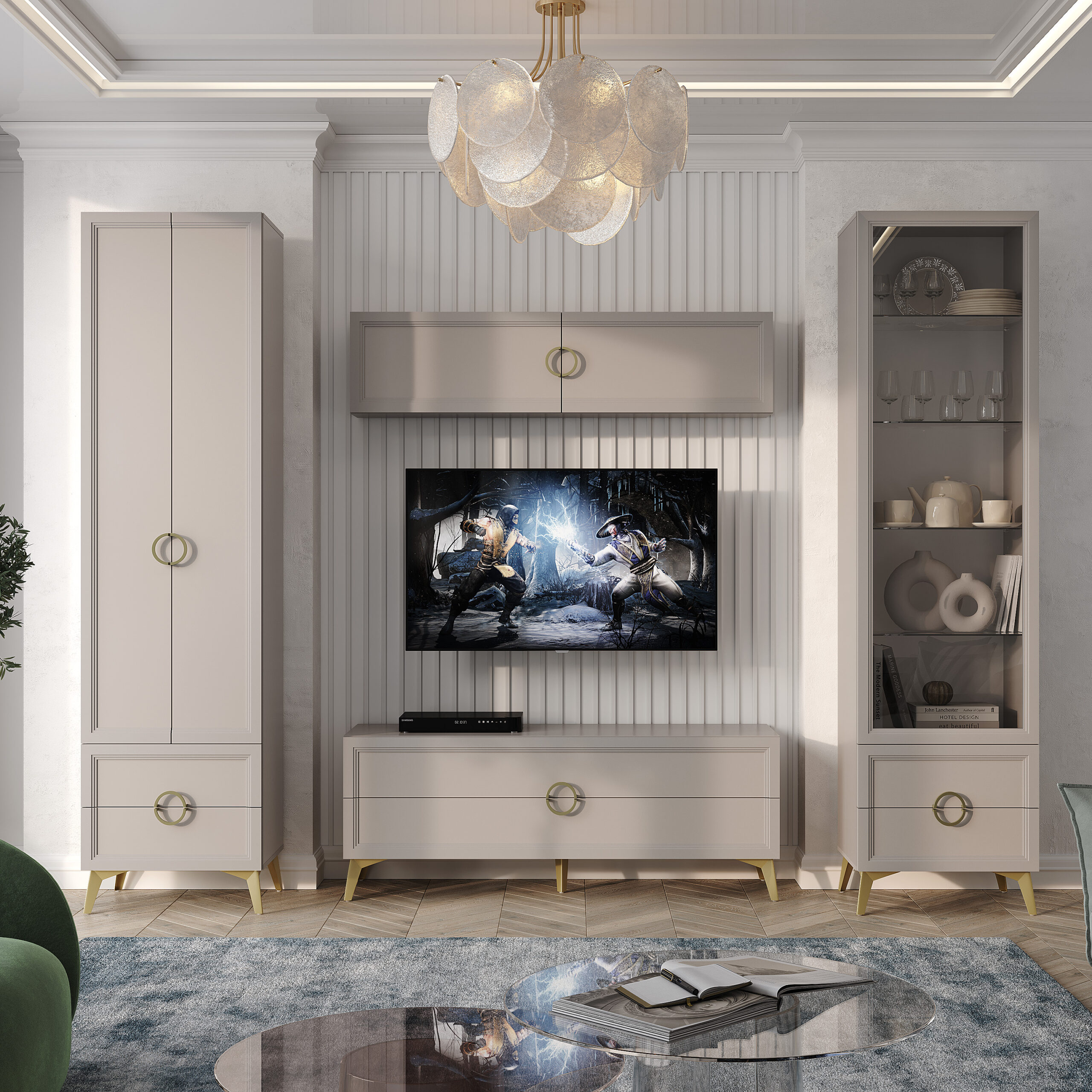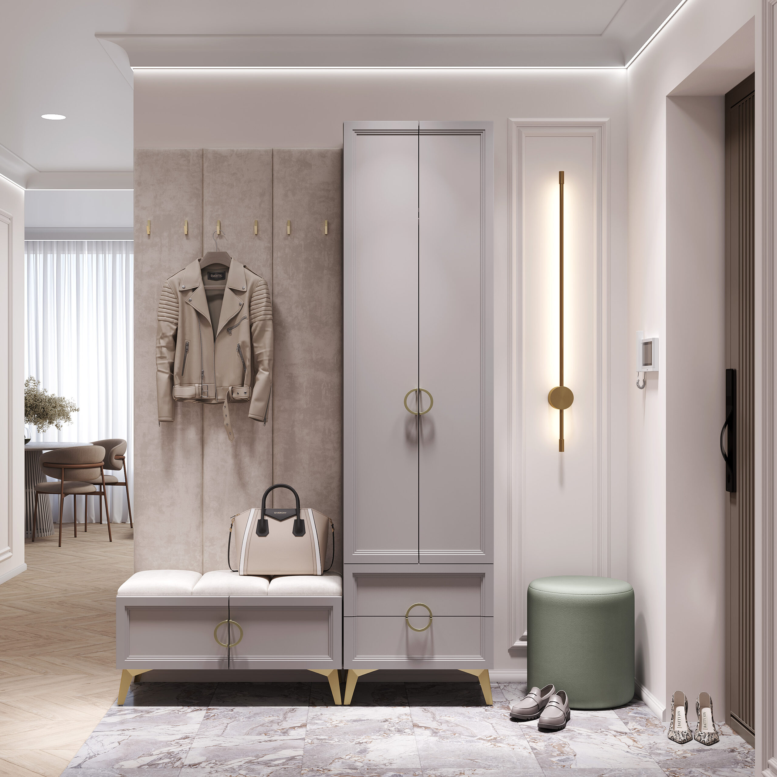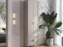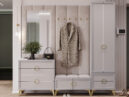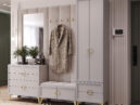 Фасады выполнены из ЛДСП в цвете «кашемир» толщиной 16 мм, а по краям фасады облицованы рамочным профилем из МДФ с рельефной фрезеровкой толщиной 26 мм.