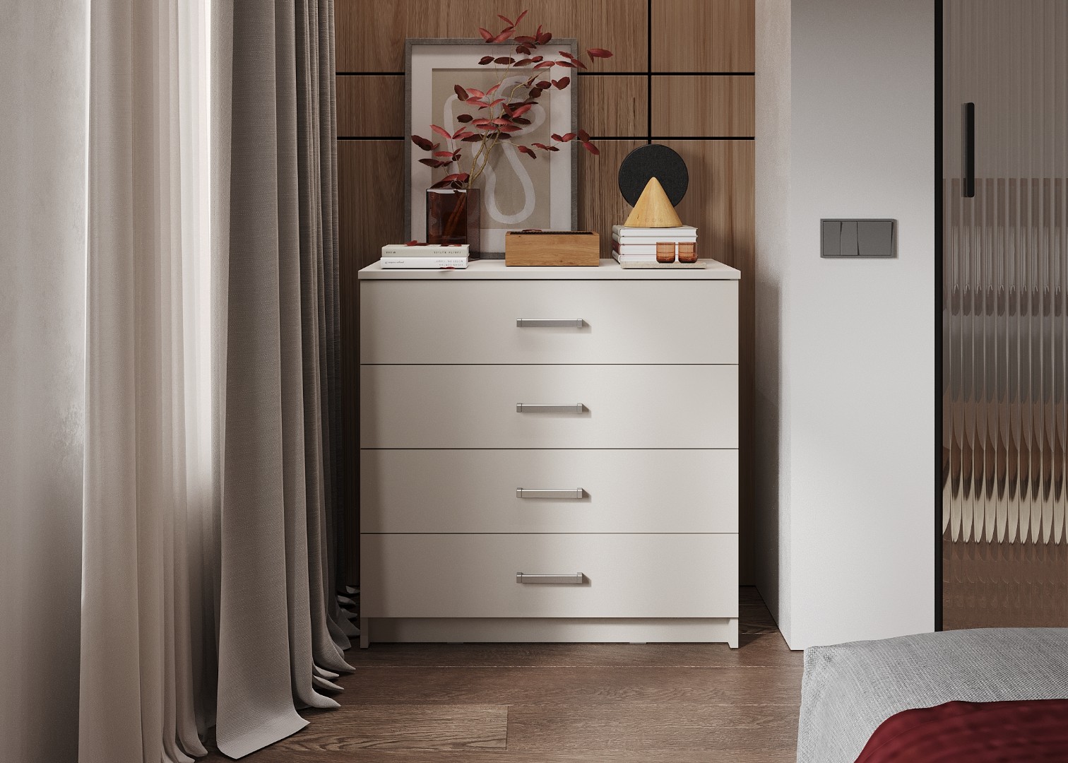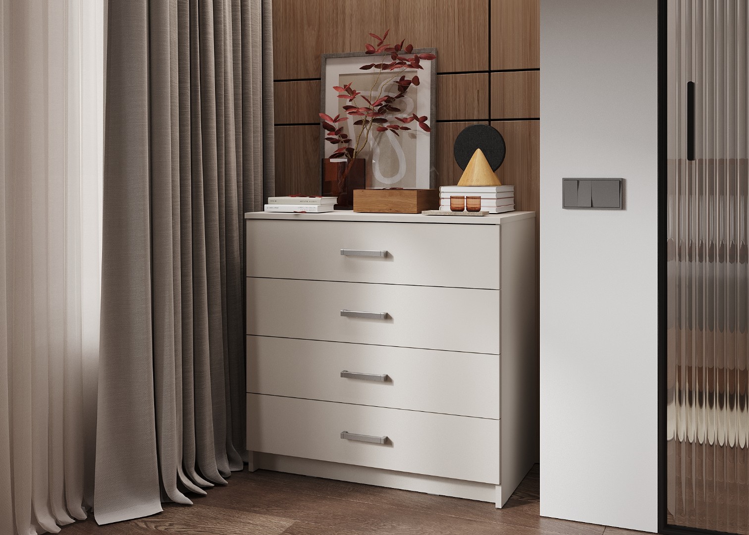 Комод ЭВА КМ-023 в цвете «Кашемир» выполнен в стиле современный минимализм. Его отличают лаконичные формы, отсутствие лишнего декора и нейтральная матовая текстура, что позволяет интегрировать его в интерьеры скандинавского стиля, хай-тек или неоклассики.