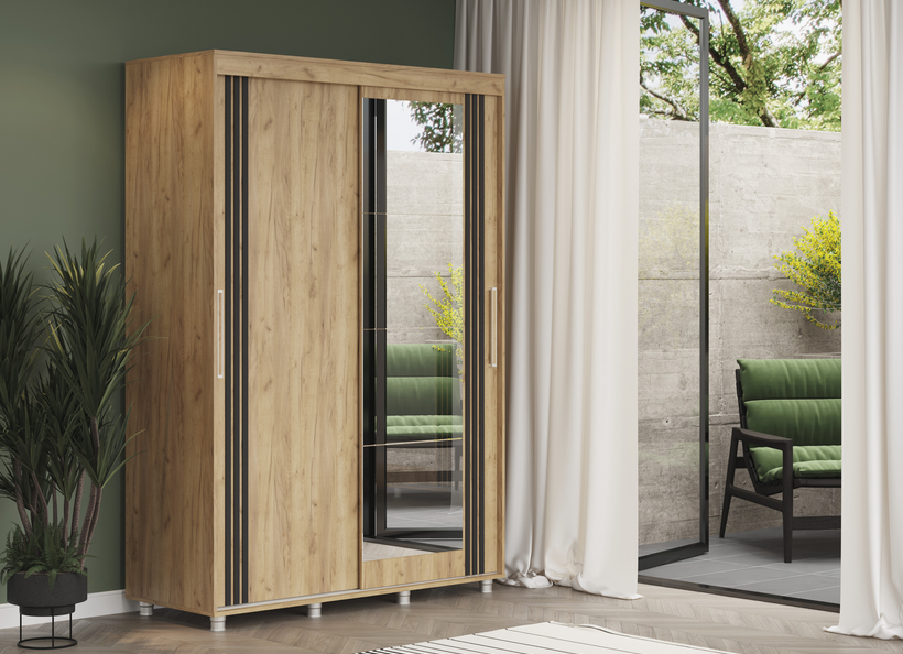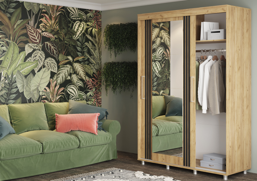 Шкаф-купе Форест 1.5 м в цвете «Дуб Крафт золотой» от мебельной компании «Стиль» — это современная двухдверная модель с зеркальным фасадом и текстурой натурального дерева.