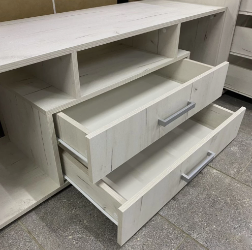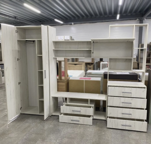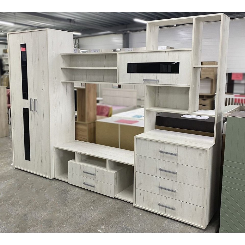 • Комплектация: тумба под ТВ, шкаф для одежды, комод, полки, ящики с роликовыми направляющими.