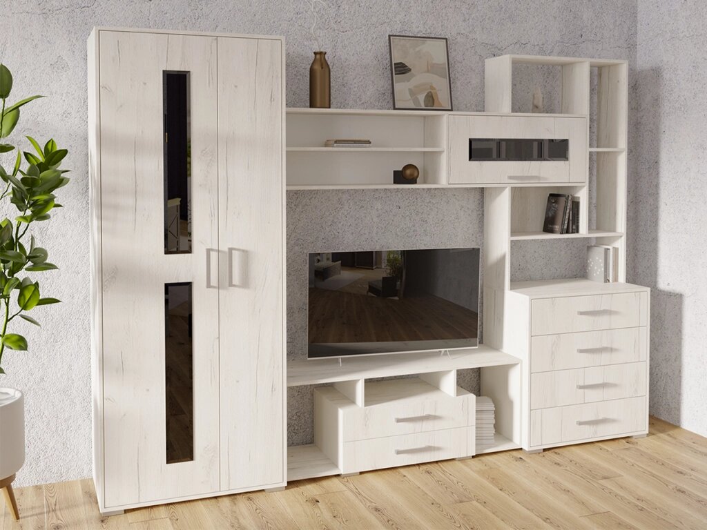 Гостиная «ЕВРОПА-1» в цвете «дуб крафт белый» — это модульная стенка, которая сочетает функциональность и современный дизайн. Она подходит для хранения книг, декора и техники, а светлый древесный оттенок визуально расширяет пространство