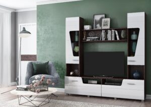 Фасады модульной гостиной «Фарго» выполнены из МДФ и покрыты эмалью льняного цвета. Корпус ЛДСП в цвете «Персидский жемчуг». Стиль коллекции задает модная вертикальная фрезеровка фасадов и оригинальная фурнитура золотого цвета. Надёжность и функциональность гостиной придают высокие опоры из массива, а стеклянные витрины сделают интерьер более светлым, легким и современным.