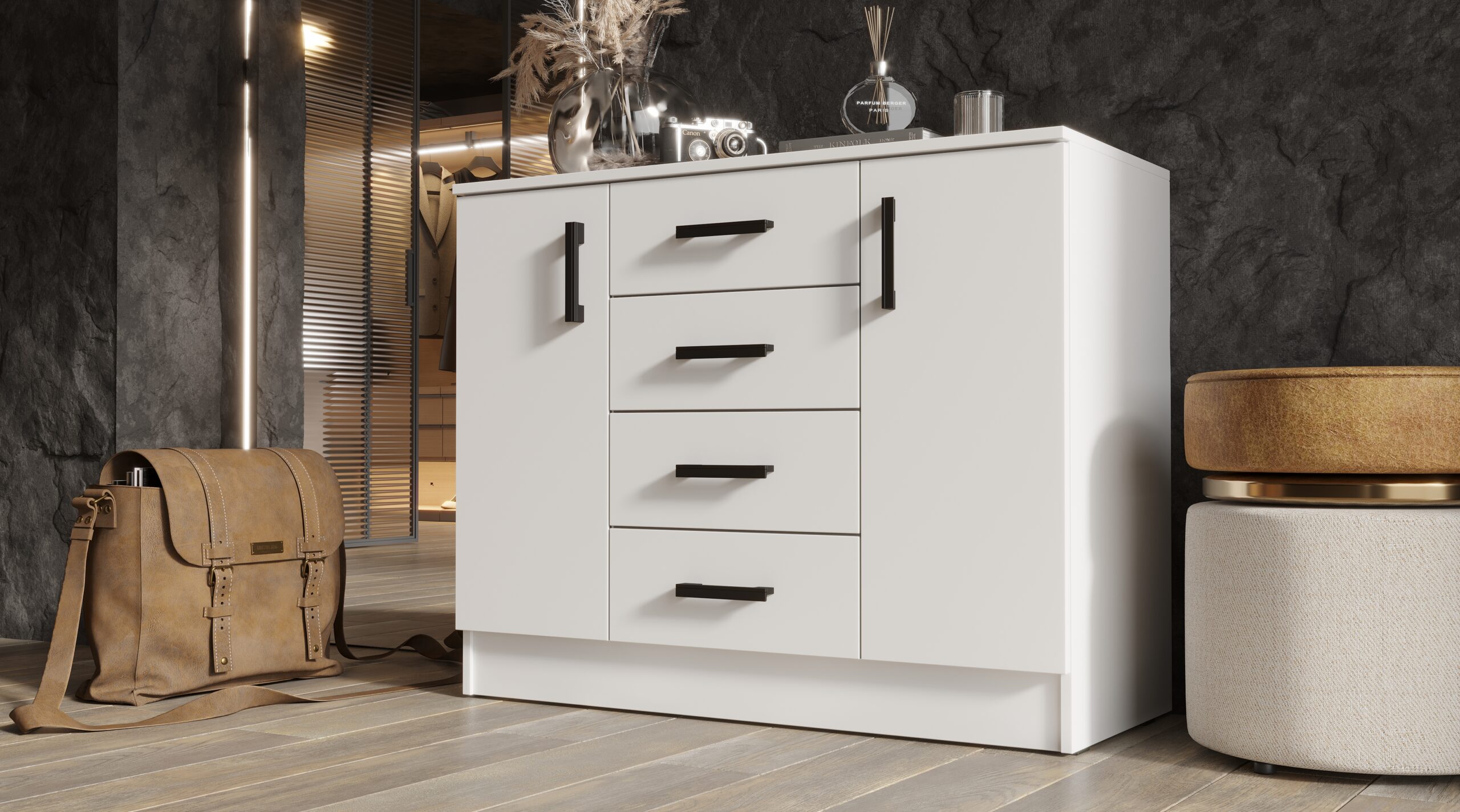 • Четыре выдвижных ящика расположены вертикально, обеспечивая удобный доступ к содержимому. Идеально подойдут для хранения белья, одежды, аксессуаров или других мелочей.