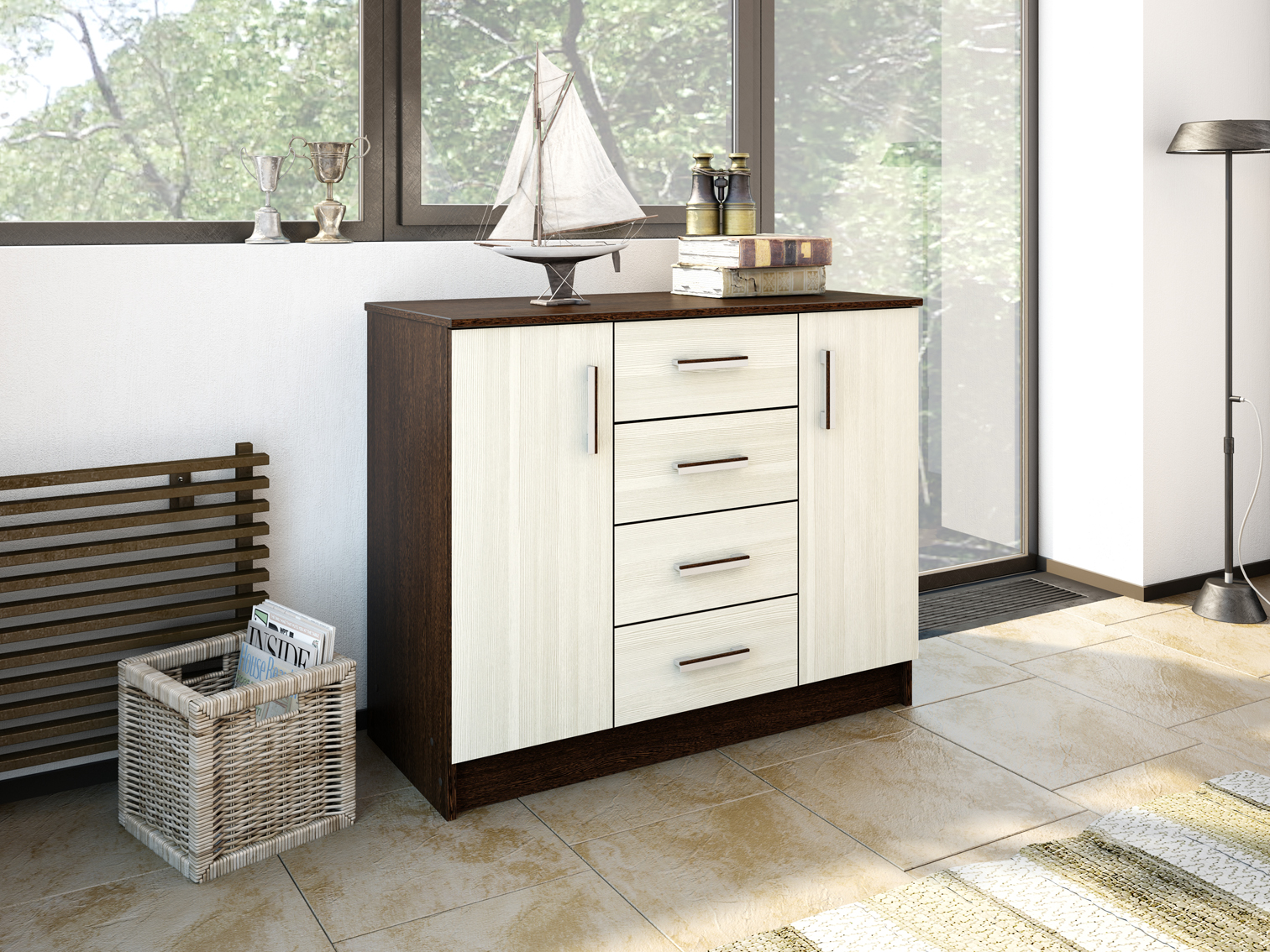 • Практичность: сочетание ящиков и дверец обеспечивает разнообразие вариантов хранения.