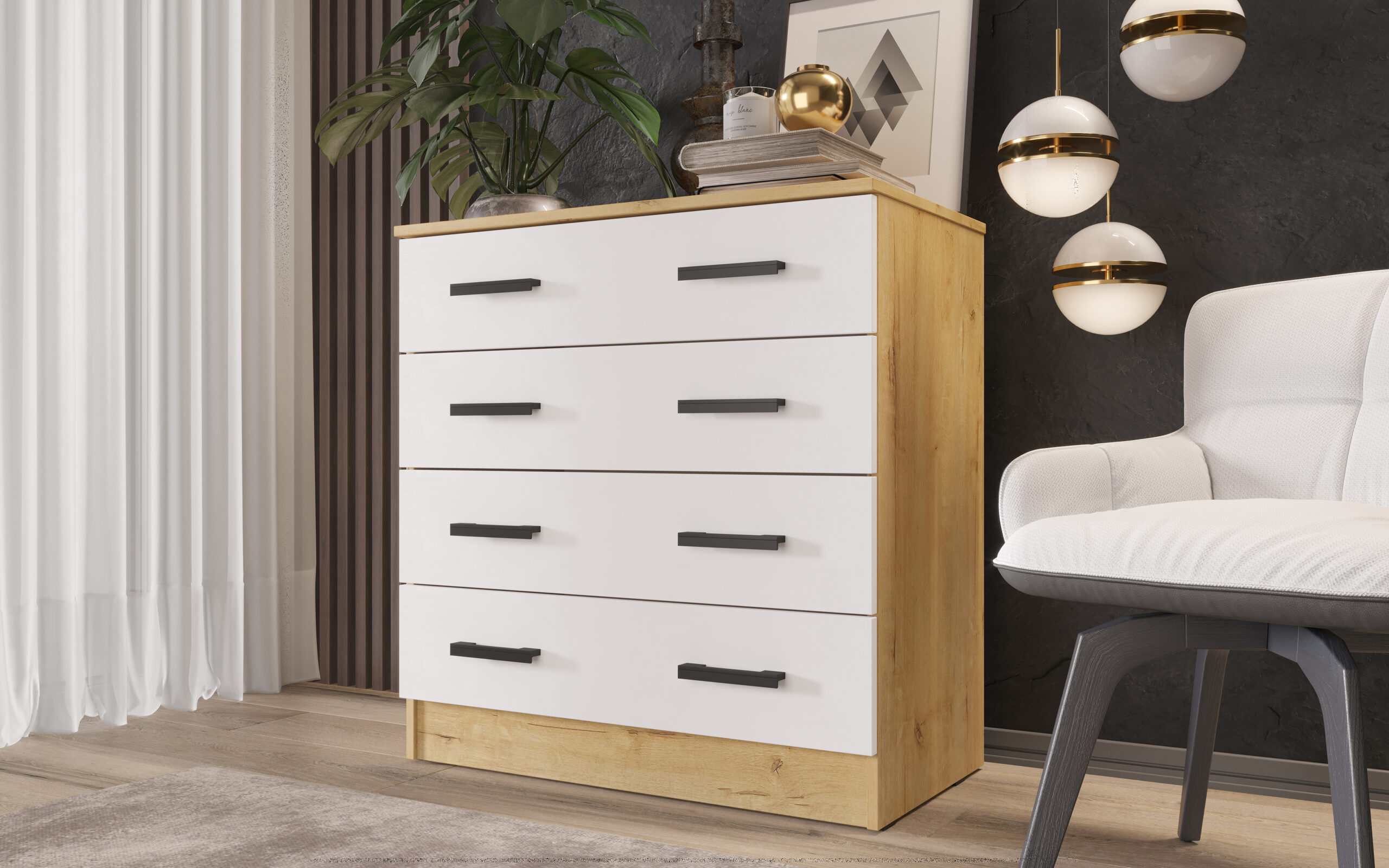 Элегантный комод с четырьмя вместительными ящиками станет настоящим украшением вашего интерьера. Лаконичный дизайн сочетает в себе современную эстетику и функциональность — он отлично впишется как в минималистичную, так и в классическую обстановку.