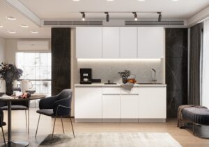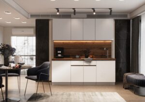 Эргономика кухни «Честер» продумана таким образом, чтобы каждый элемент был под рукой. Высота столешницы, расположение шкафов и ящиков учитывают удобство пользователя. Вы сможете легко готовить, не испытывая дискомфорта. Дополнительные элементы, такие как встроенные освещения и розетки, делают использование кухни ещё более комфортным.