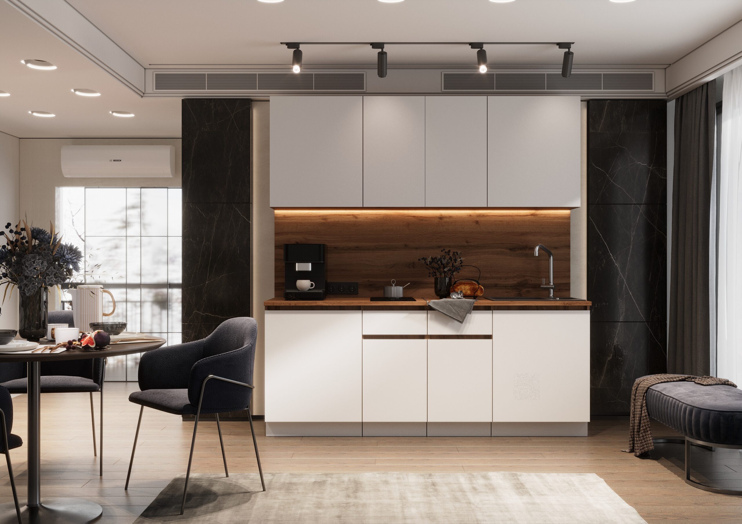 В комплекте: ЛДСП корпус Дуб Вотан, цоколь в цвет корпуса. Фасад ЛДСП Белый. Ручка 160 мм. Направляющие роликовые. Высота верхних шкафов 720 мм. Столешница 1000 мм+1000мм, высота 26 мм