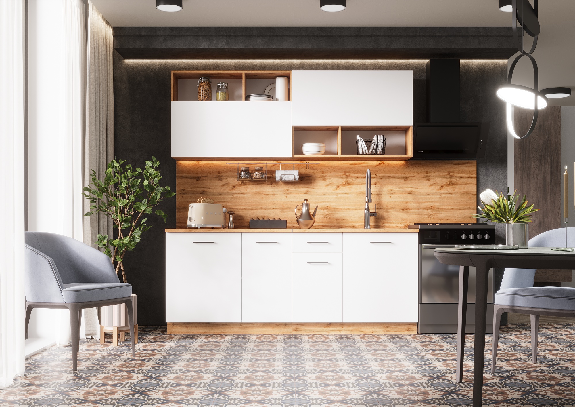 В комплекте: ЛДСП корпус Дуб Вотан, цоколь в цвет корпуса. Фасад ЛДСП Белый. Ручка 160 мм. Направляющие роликовые. Высота верхних шкафов 720 мм. Столешница 1000 мм+1000мм, высота 26 мм