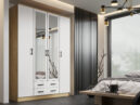Наполнение: Шкаф разделен на три секции. В центральной части за зеркальными створками расположена металлическая штанга для одежды, а в нижней части — два выдвижных ящика. Боковые секции укомплектованы вместительными полками.
