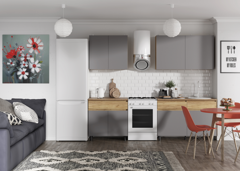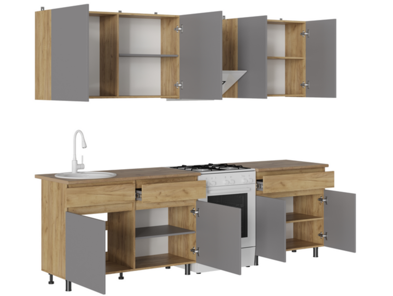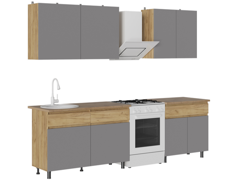Кухонный гарнитур КВИК-СТЕП 2.0 м в исполнении Дуб Крафт золотой /Серый Шифер — это готовое решение, сочетающее древесную текстуру корпуса с лаконичными серыми фасадами.