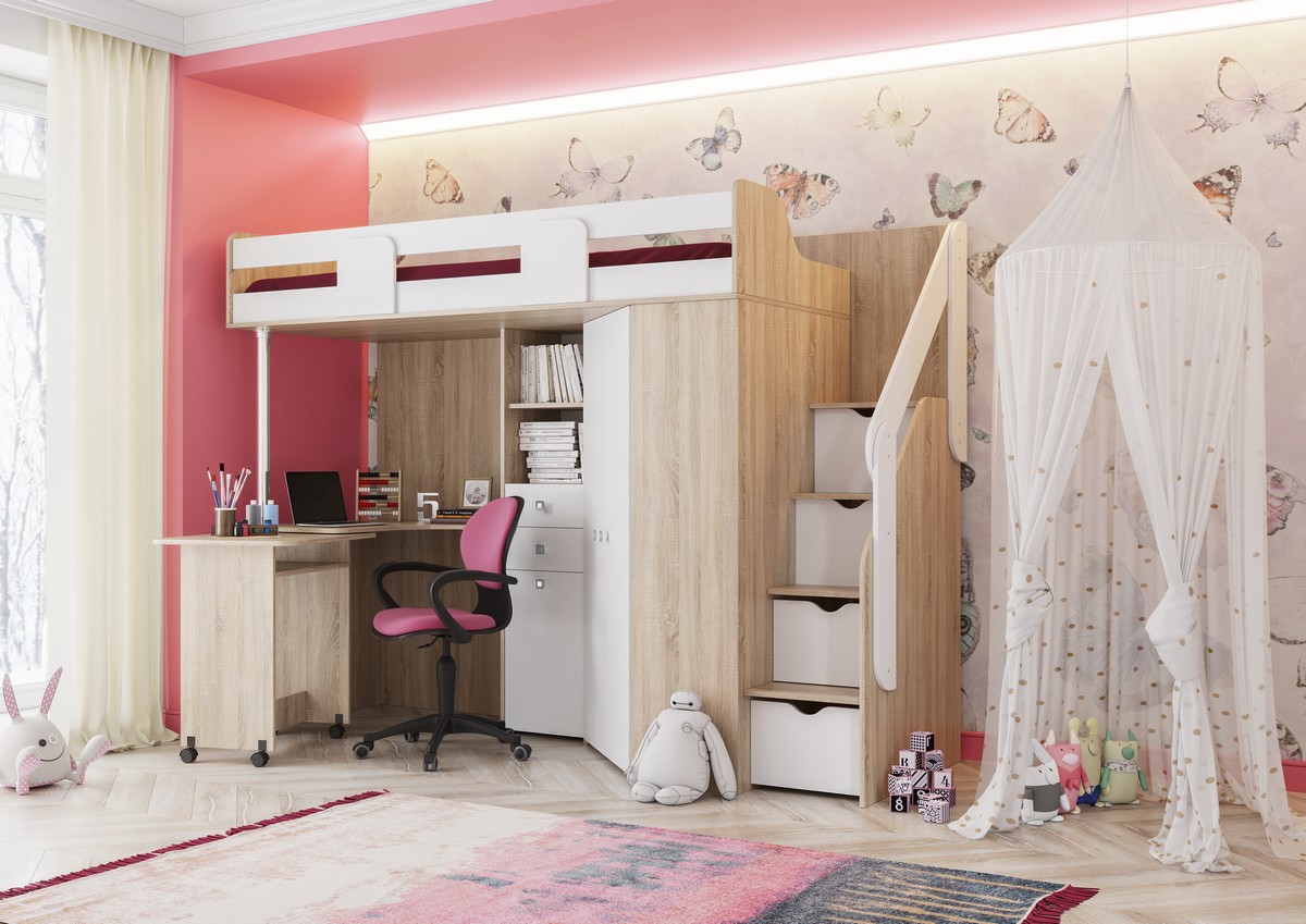 Вашему ребенку однозначно понравится удобство кровати-чердака Мийа-А. Эргономичный дизайн изделия продуман до мелочей, и особый акцент в нем сделан на обеспечении комфорта ребенка, а также на его безопасности.