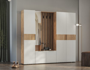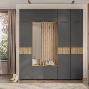Прихожая Олива ПР-04 — это элегантное и функциональное решение для любого интерьера. Коллекция представлена в тренировках пудровых оттенках. Фрезеровка на фасадах создает интересные текстурные контрасты и визуальные акценты. Кроме того, этот элемент декора также помогает скрыть мелкие загрязнения, что упрощает уход за мебелью. Черные металлические накладные ручки и петли с доводчиками обеспечивают удобство в использовании.