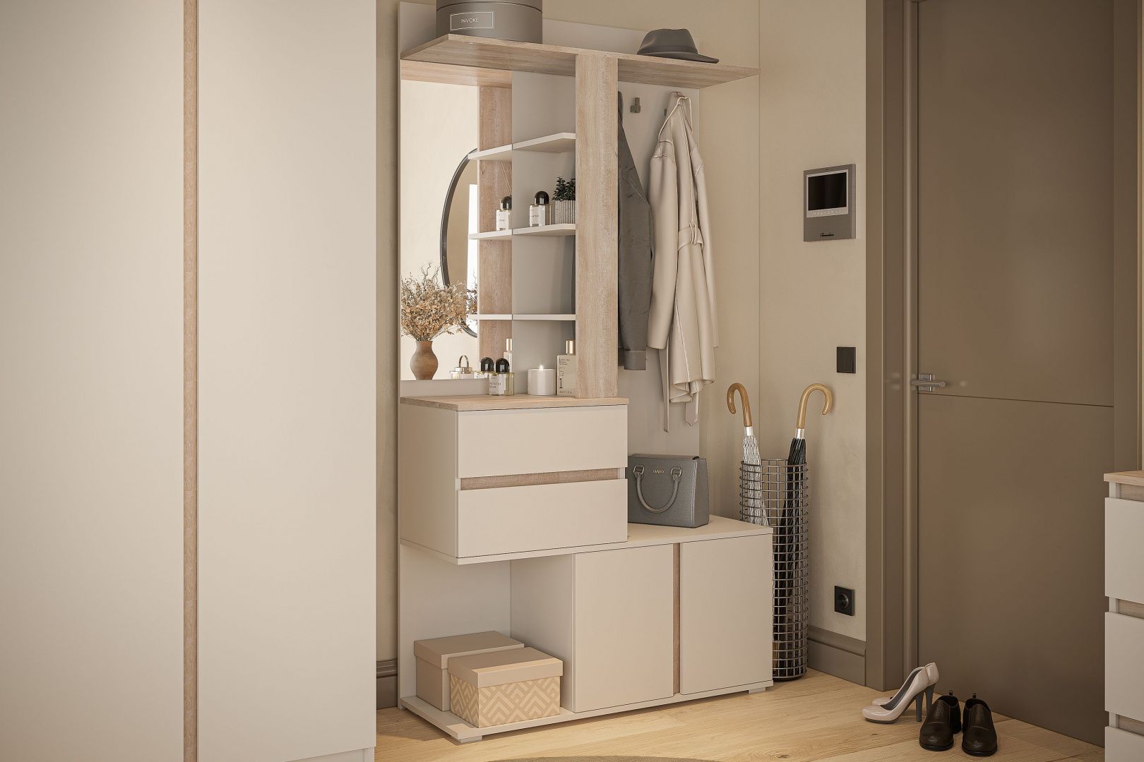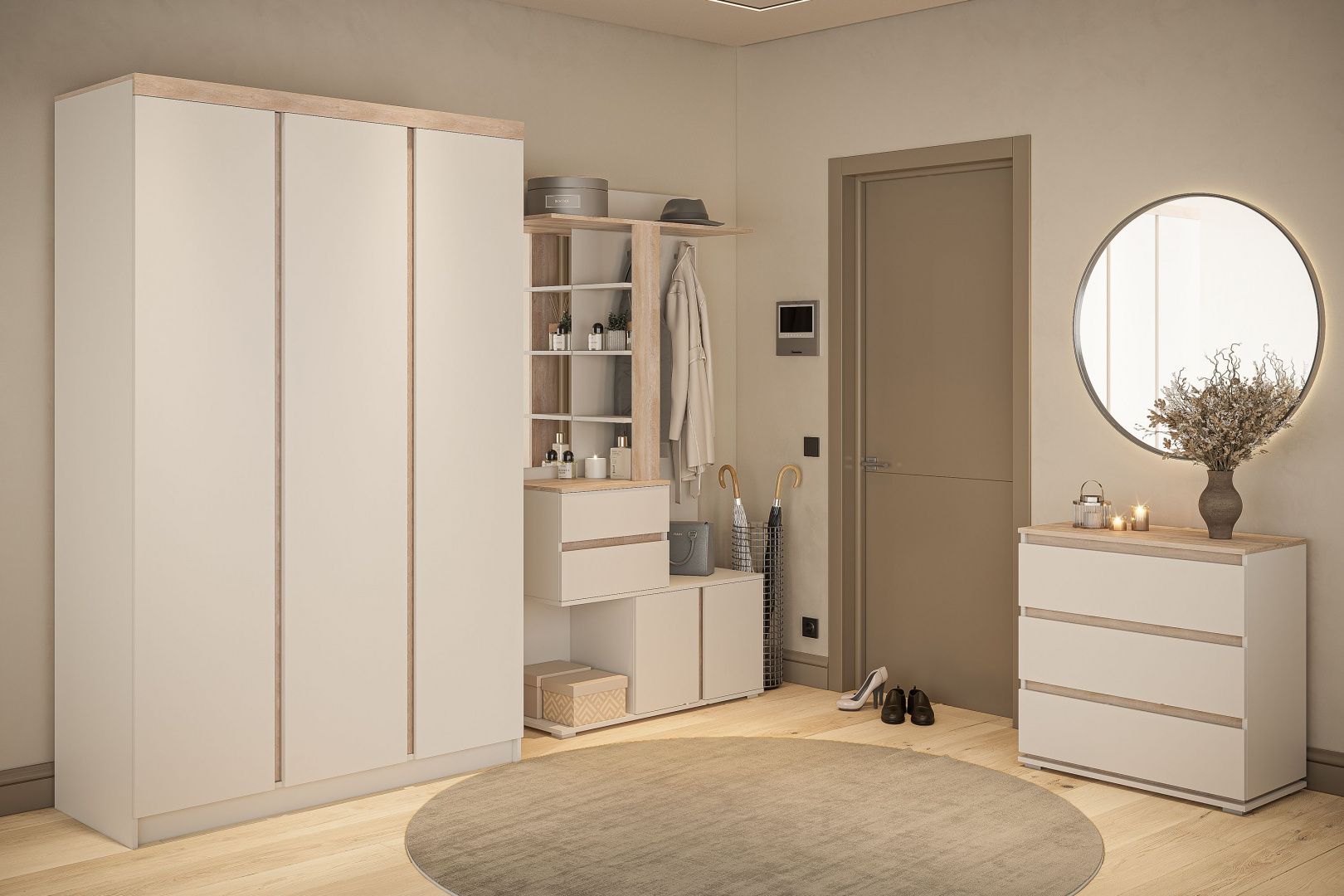 Тип: Сквозная модульная система, что позволяет комбинировать элементы прихожей с модулями из серий для спальни или гостиной той же коллекции.
