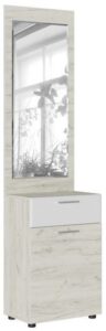 Элегантная прихожая «Варда» поможет разместить все необходимые вещи. Модель очень лаконична и не занимает много пространства. Дверца шкафа, за которой расположились полки и штанга для верхней одежды, оснащена двумя зеркалами. Прихожая имеет открытые крючки, нишу для обуви и небольшой пуф, обтянутый экокожей. Цветовое решение изделия позволит ему стать частью интерьера любого стиля.