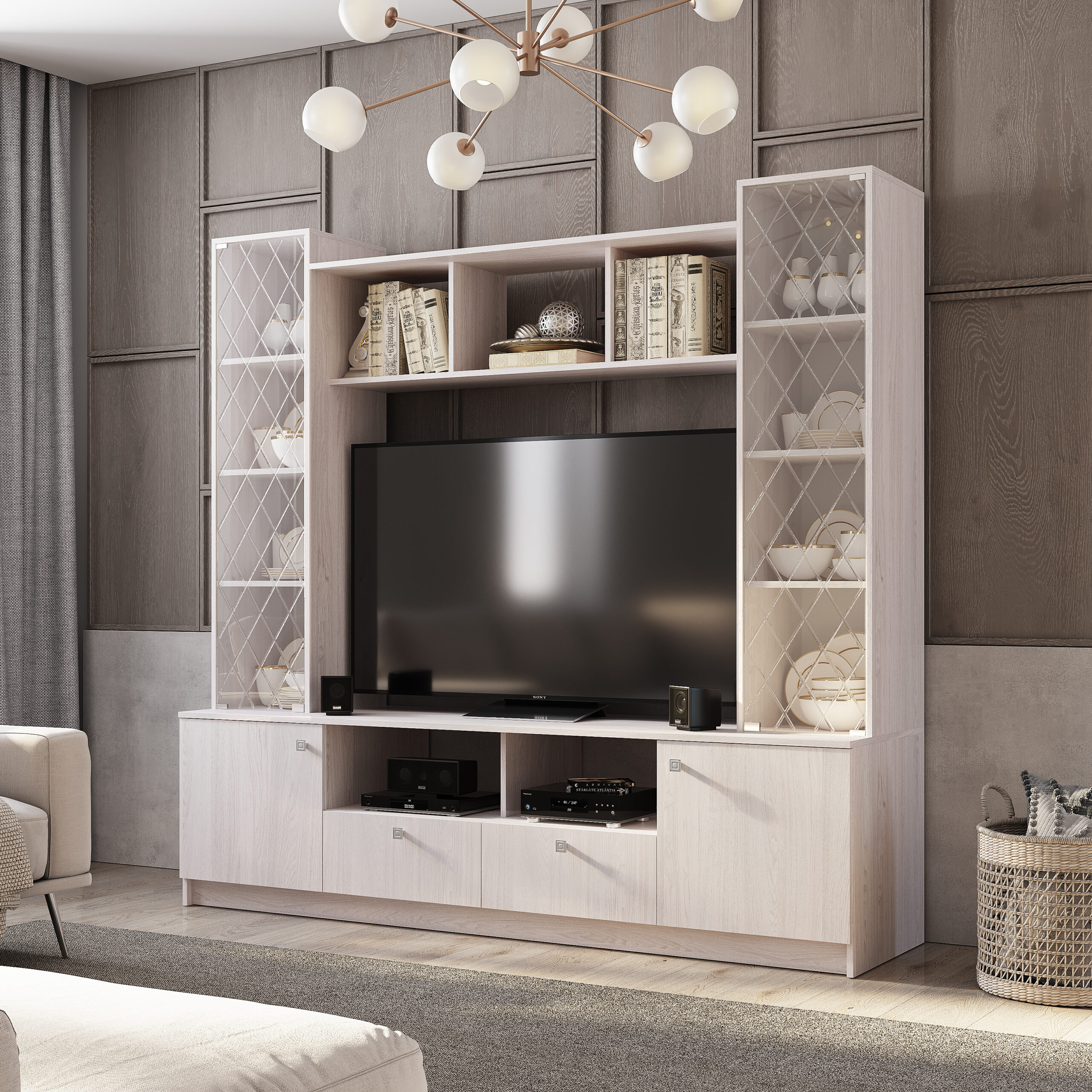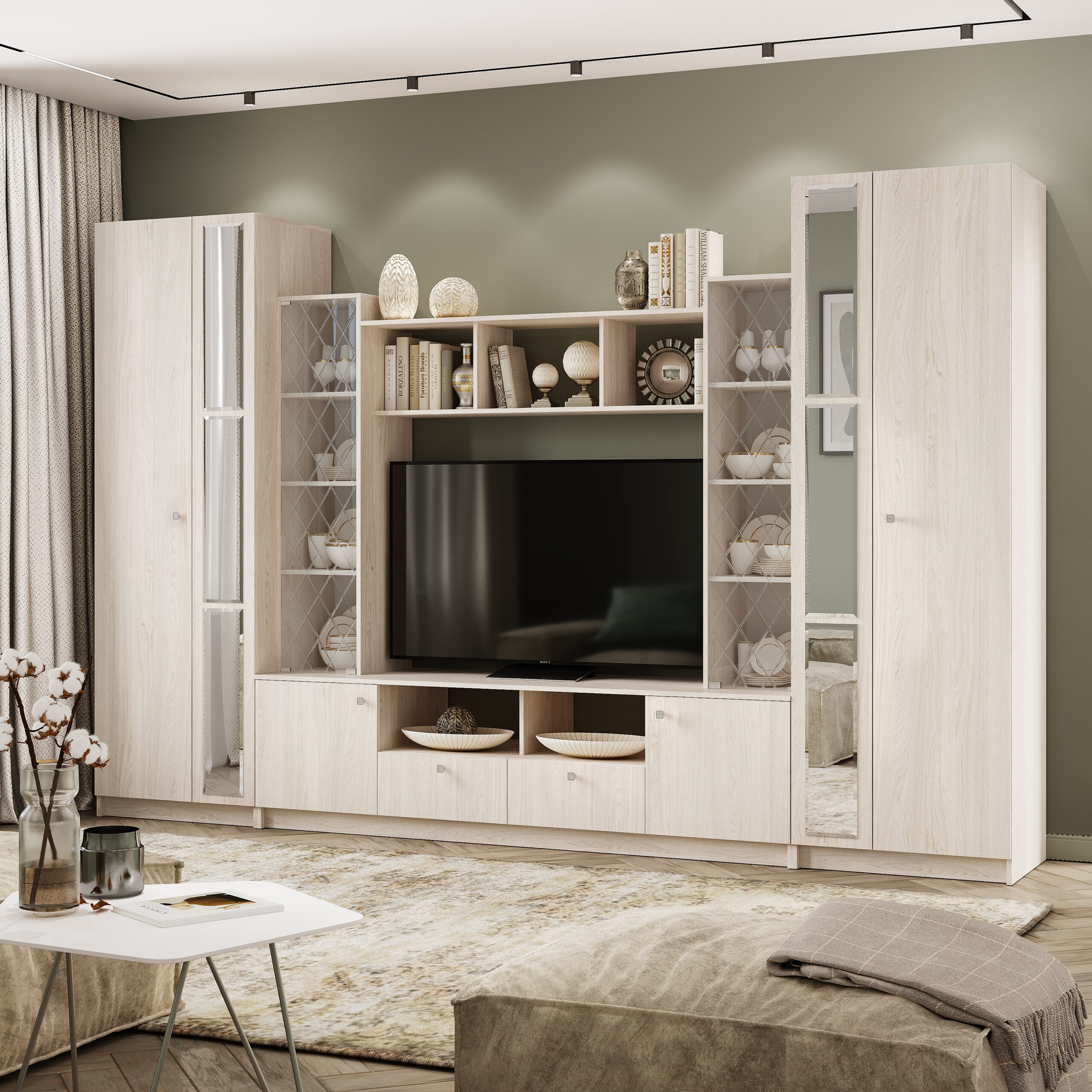 Модульная функциональная гостиная «Зарина», выполненная в классическом стиле, станет приятным акцентом в интерьере вашей квартиры. Спокойная древесная фактура цвета «ясень белый» делают модель изысканной и стильной. Стеклянные створки по бокам просторной зоны под ТВ придают визуальный эффект лёгкости и невесомости, подчеркивая изысканный вкус обладателя гостиной. Благодаря выбранному цвету пыли и грязи на ней совершенно незаметно, а это огромный плюс для домохозяек!