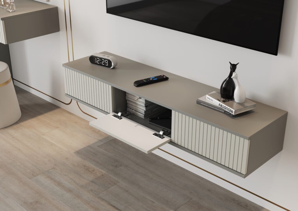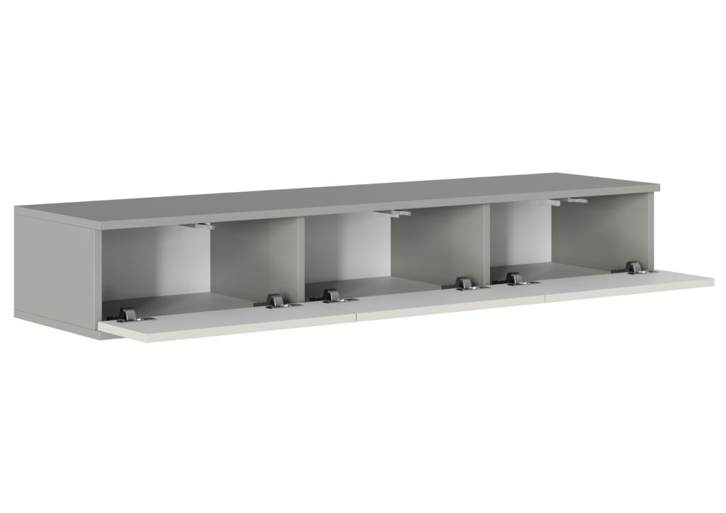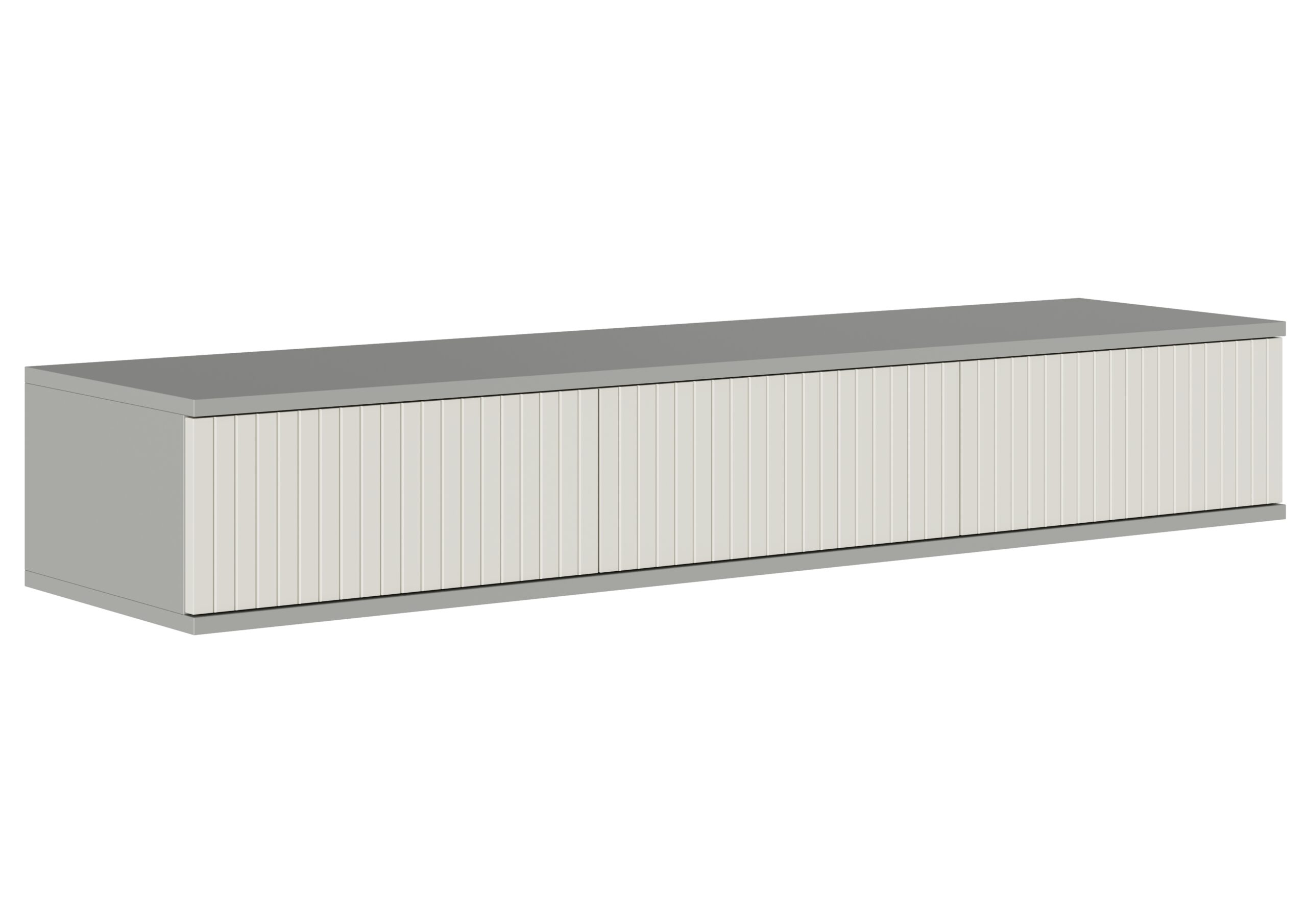 Фасады тумбы оснащены тремя горизонтально открывающимися створками, которые открываются вниз. Они оформлены фрезеровкой.
