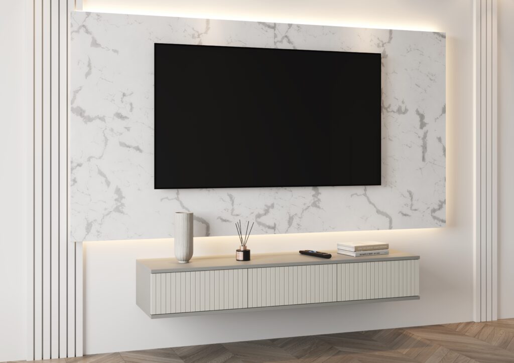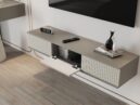 Фасады тумбы оснащены тремя горизонтально открывающимися створками, которые открываются вниз. Они оформлены фрезеровкой, что придает изделию изысканный вид.