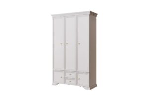 Очень вместительная модель трехстворчатого шкафа с ящиками будет прекрасно смотреться в вашей спальне. Изделие состоит из нескольких зон для хранения одежды и обуви, включая два выдвижных ящика для мелких вещей, отделение для одежды на вешалках и вместительные полки. В центральную створку вставлено зеркало, что помимо основной функции, позволяет визуально расширить пространство. Сборка не универсальная.