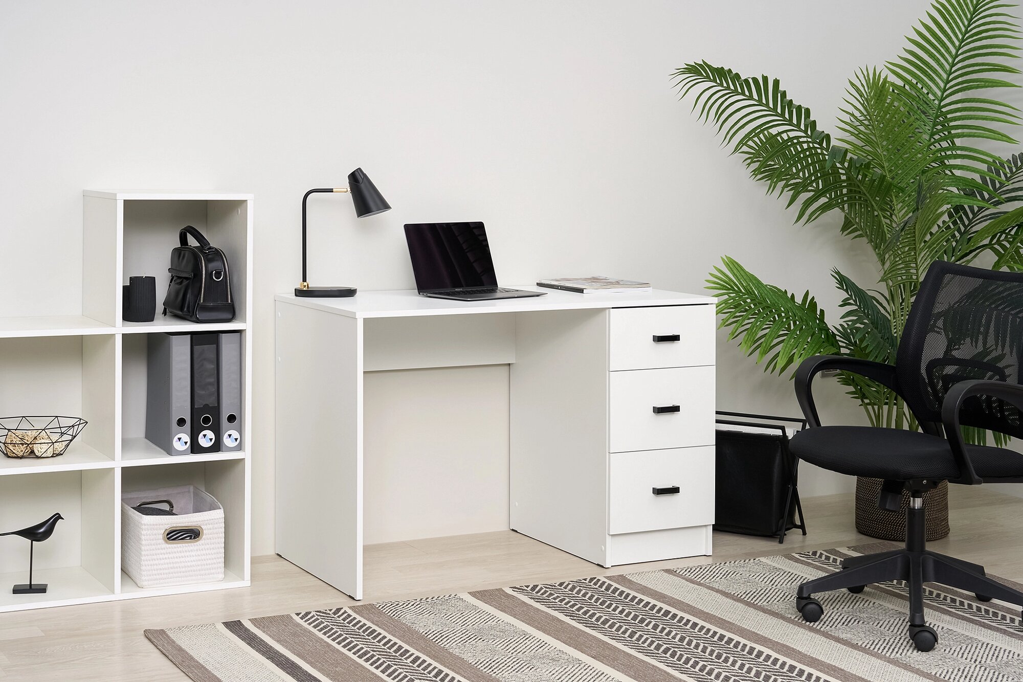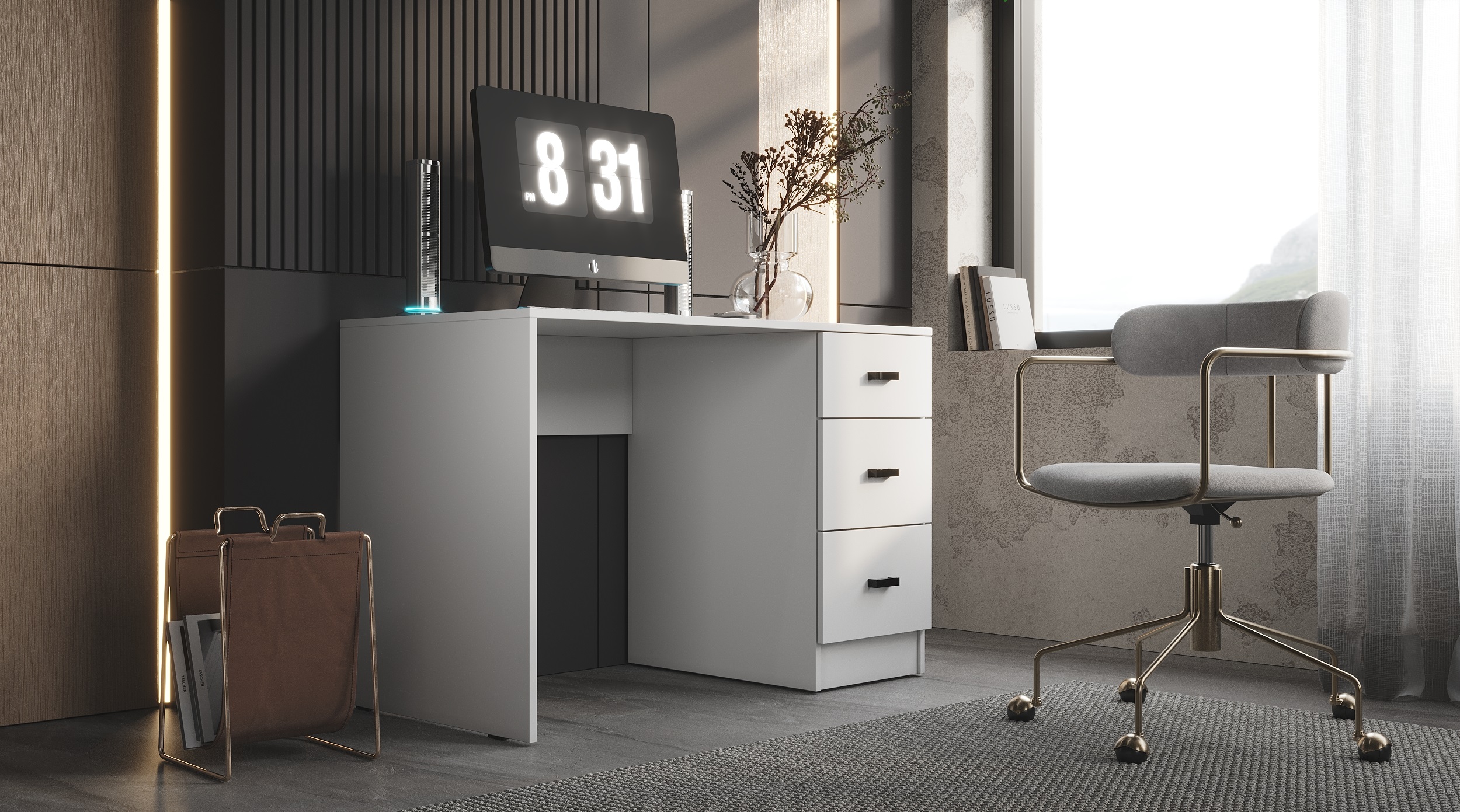 Письменный стол «Стандарт» в белом гладком исполнении — это компактная и функциональная модель, которая подходит для дома, офиса или детской комнаты. Стол изготовлен из ЛДСП, имеет три выдвижных ящика и лаконичный дизайн, который легко вписывается в современный интерьер.