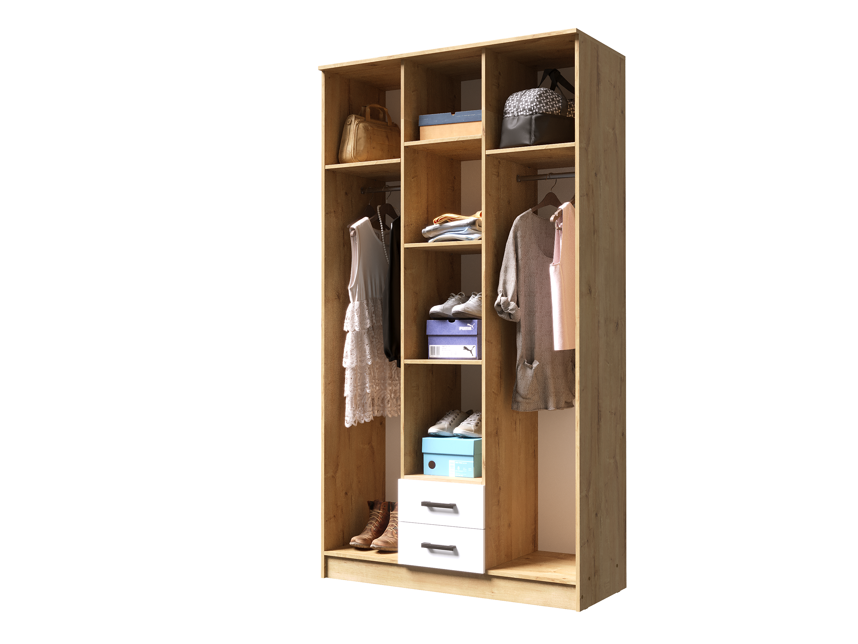 Боковые секции: Оборудованы штангами для одежды на вешалках.