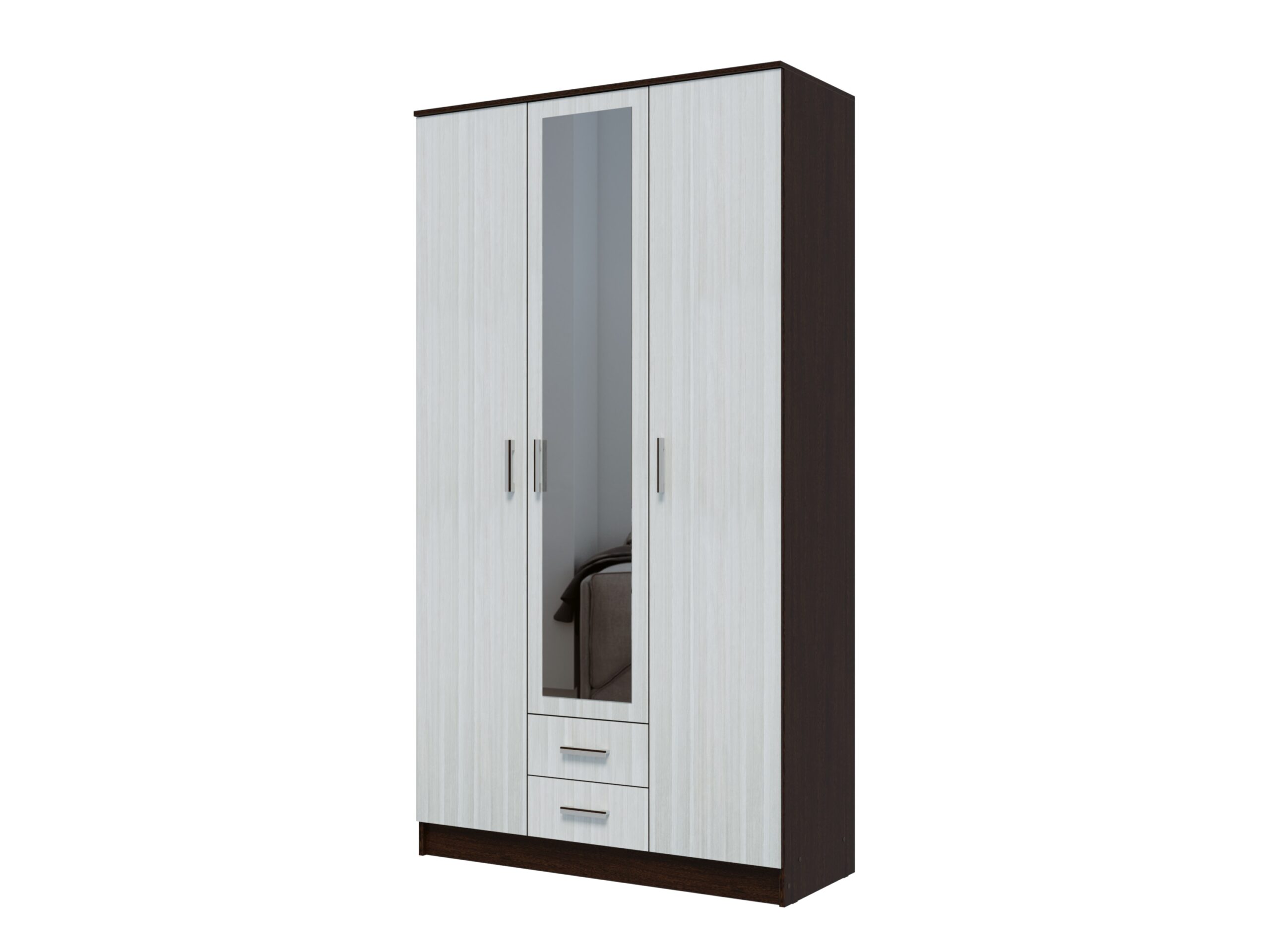 Шкаф «Трио» (с зеркалом) в расцветке Венге/Лоредо — это трехдверная распашная модель от мебельной фабрики «Эра» (г. Пенза), предназначенная для хранения одежды и белья. Изделие отличается современным двухцветным дизайном: темный корпус «Венге» контрастирует со светлыми фасадами «Лоредо».