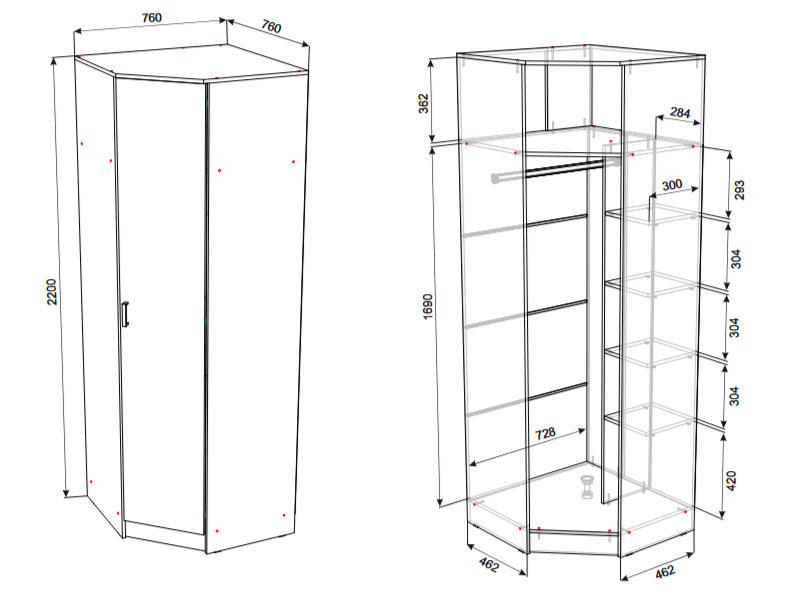 • Габариты: Высота — 2200 мм, ширина и глубина — 760х760 мм (или 760х487 мм в зависимости от точки замера).