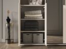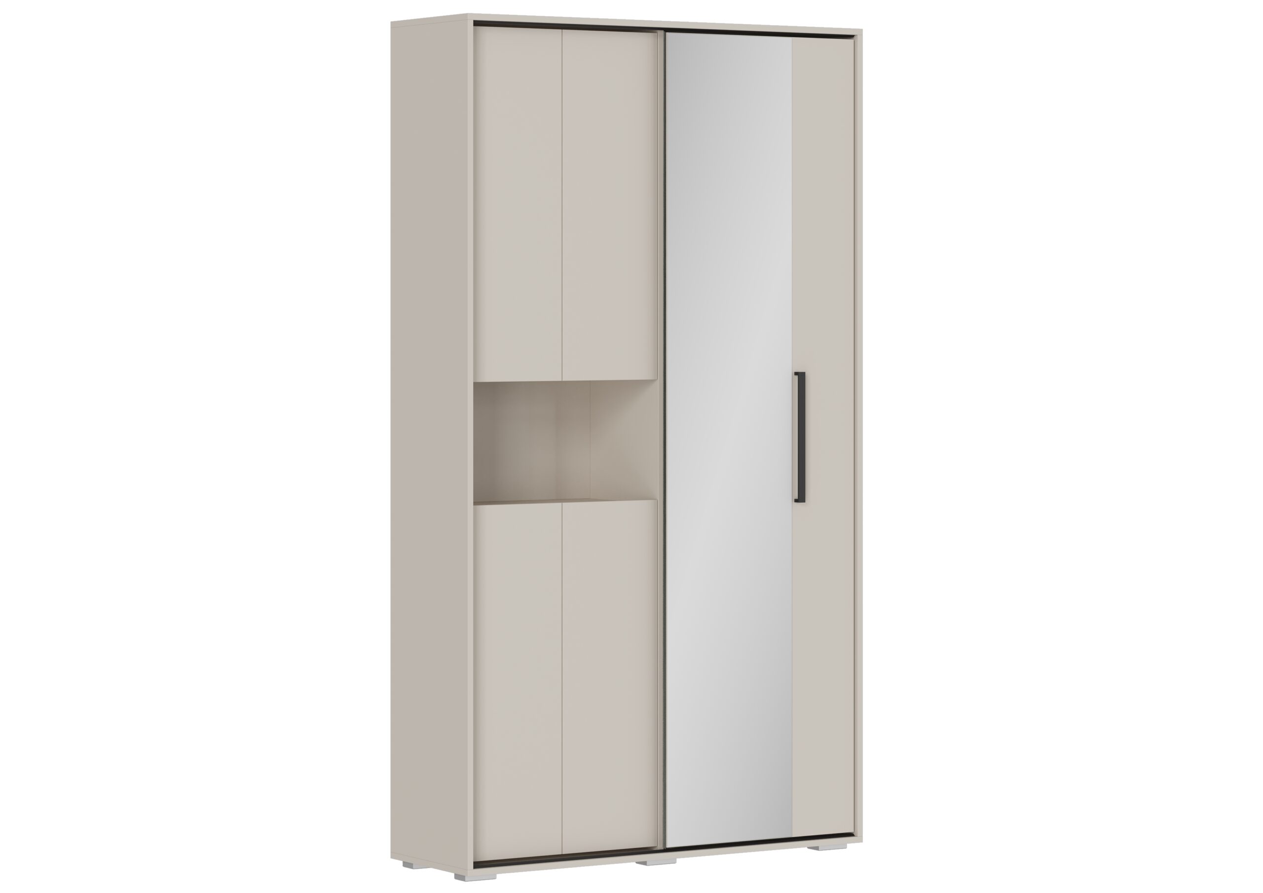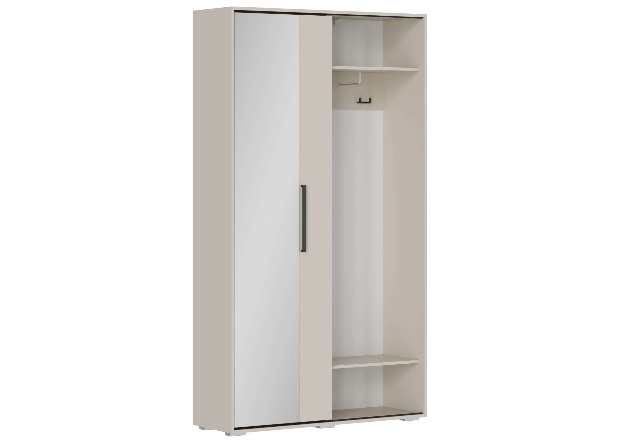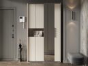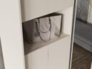 — Разделение на секции: Одна часть прихожей включает две одинаковые секции с полками, закрытые створками. В каждой секции предусмотрено по две съёмные полки, что позволяет настраивать пространство под ваши нужды. Открывание створок осуществляется за выступ, что делает использование шкафа более удобным.